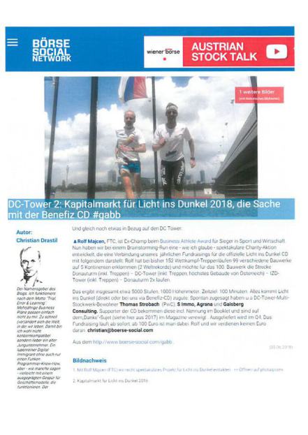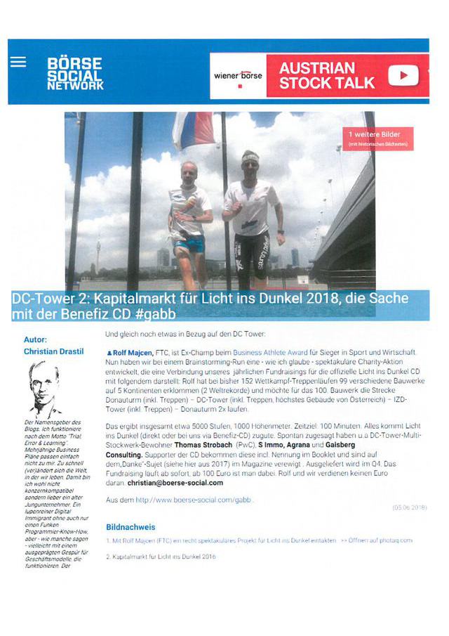 Weitere Infos: Siehe Artikel in BÖRSE SOCIAL MAGAZINES, 5.6.2018. "DC Tower 2: Kapitalmarkt für Licht ins Dunkel 2018, die Sache mit der Benefiz CD"